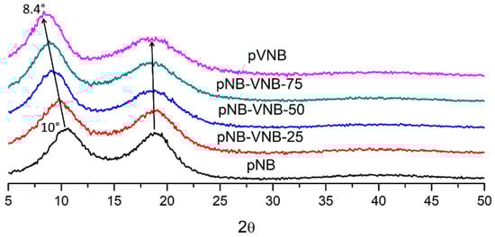 The wide-angle X-ray scattering (WAXS) pattern of the polynorbornenes included two broad peaks, indicating that the polymers are completely amorphous (Figure 6). It is generally accepted that the peak at higher 2θ correlates with intrasegmental interactions while the peak at lower 2θ correlates with intersegmental interactions [15,28,29]. Three interesting trends are visible with an increase in exocyclic vinyl group presence in the polymers. First, the intrasegmental peak broadens at higher 2θ. This can be explained by the increasing presence of the exocyclic vinyl groups which may be capable of increasing the amorphous character of the intrasegmental packing. Second, the intersegmental peak shifts from 10° to 8.4°. This corresponds, using Bragg’s law, with a d-spacing shift from 8.8 to 10.5 Å, indicating that the increase in exocyclic vinyl group presence considerably increases intersegmental d-spacing. Third, relatively increasing scattering intensities of the low 2θ peak with increase in VNB content indicates that more numerous intersegmental scattering events took place compared to the intrasegmental scattering. Therefore, based on these observations, an increase in exocyclic vinyl group content seems to benefit larger intersegmental spacing. Comparing this data with other addition type polynorbornenes with different side groups, it is clear that the X-ray scattering data for pNB is similar to previously published pNB X-ray data (Table 3) [17]. Also, the intersegmental d-spacing of pVNB is situated between the intersegmental d-spacings of polynorbornene with a methyl group and with a butyl group, further confirming the trend that intersegmental d-spacing increases with increasing side-group bulkiness [28,30].