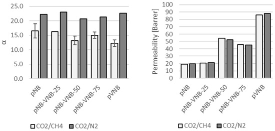 First, the membranes were tested for CO2/CH4 and CO2/N2 separations using a mixed-gas feed (Figure 7) to investigate the influence of the exocyclic vinyl group. The permeability quadrupled for both gas pairs with increasing VNB content, while αCO2/CH4 declined slightly and αCO2/N2 remained largely constant, even though trends hardly exceed the experimental error. Single-gas permeabilities were collected as well to easily compare them with other published data (Table 4). Unfortunately, the membrane pNB-VNB-25 had become defective and was left out of the analysis. For the permeabilities, a trend is visible confirming the previous mixed-gas permeabilities: By increasing the VNB content, the permeability increases. pVNB even achieved a CO2 permeability of 104 Barrer. This is also in line with the WAXS trend which shows that a larger VNB content resulted in larger d-spacings. The permeabilities obtained in this work for pNB are close to those previously published [15]. The permeabilities of pVNB are close to the one of the polynorbornenes with a methyl side group [28]. The ratio of two single-gas permeabilities gives the ideal selectivity of that gas pair. The ideal selectivity differs from mixed-gas selectivity in the sense that it allows for a more direct comparison with other single gas measurements and the resulting ideal selectivities, but it does not take into account any interactions between the mixture components as is the case with mixed-gas selectivity. These ideal selectivities show a slight decrease with increase in VNB content (Table 5). In the case of H2/CO2, this even results in a reverse selectivity for pVNB.
