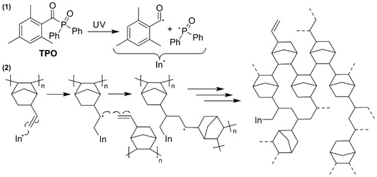 (1) TPO produces two initiator (In) radicals by exposure to UV light. (2) The initiator radicals start a radical polymerization with the exocyclic vinyl groups, thereby crosslinking pVNB.