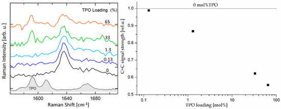 The extent of crosslinking was first assessed by FT-IR (Figure S2) where no measurable difference in C=C stretching or bending signals were found. In contrast, Raman clearly showed a decrease in C=C signal at 1637 cm−1 with an increase in TPO loading (Figure 9). This confirms that the extent of crosslinking can be controlled by varying the TPO loading. However, no full conversion could be obtained as even with 65 mol % TPO, only about 55% of vinyl groups were converted.