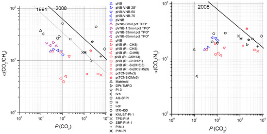 (Left) CO2/CH4 and (Right) CO2/N2 Robeson plots with polynorbornenes with increasing VNB content (blue), pVNB with increasing TPO loading (purple), other polynorbornenes (pink) and polyimides, PIMs and thermally rearranged polymers (black). * Single-gas PCO2 data [Barrer] obtained using Equation (3). Data obtained from [7,9,15,28,34,35,36,37,38,39,40,41,42,43,44]. Upper bound data was taken from [33].