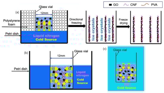 Schematic representation of (a) the directional freeze-drying method; (b) the non-directional freeze-drying method and (c) the refrigerator freeze-drying method. Cellulose nanofiber (CNF); polyvinyl alcohol (PVA); graphene oxide (GO).