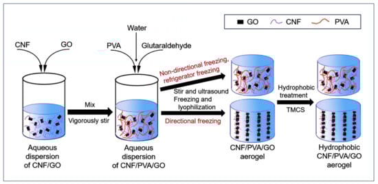 The CNF suspension (3 g, 1.275 wt %), PVA solution (0.76 mL, 0.1 g/mL), GO solution (3.825 g, 1.5 wt %) and water (2 mL) were mixed and vigorously stirred in a beaker for 1 h. Sulfuric acid (8 μL, 1.0% by volume) was added to the above suspension to adjust the pH of the mixture from 4 to 6. Then, the GA solution (80 μL, 25 wt %) was added to the resulting CNF/PVA/GO mixture. The above mixture was mechanically stirred for 1 h and sonicated in an ultrasonic bath for 30 min, and finally placed in a vacuum oven to remove any residual air bubbles. At the final stage, the obtained mixture was transferred to a cylindrical mold and then crosslinked in an oven at 75 °C for 3 h. The crosslinked aqueous gel was stored overnight in a 4 °C refrigerator for pre-cooling to avoid macroscopic cracking during the freezing step. A cylindrical mold with a mixed aqueous gel was placed in a directional freezer for a few minutes to ensure it was completely frozen; then, the mold was transferred to a freeze dryer and lyophilized for 48 h at −50 °C, and then the directional CNF/PVA/GO aerogel (d-CPGA) was obtained. In addition, refrigerator freeze-dried CNF/PVA/GO aerogel (r-CPGA) and non-directional freeze-dried CNF/PVA/GO aerogel (n-CPGA) were prepared for comparison.