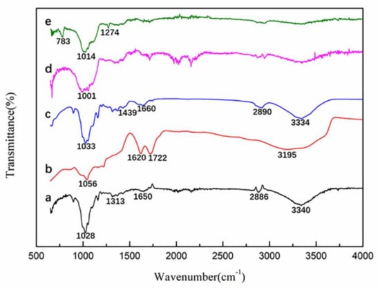 The spectrum of CNFs (Figure 4a) showed that 3340 cm−1 and 1650 cm−1 were the stretching vibration and bending vibration of -OH, 2886 cm−1 was the stretching vibration of CH, 1313 cm−1 was the bending vibration of -OH, 1028 cm−1 was the stretching vibration absorption peak of C-O, whose vicinity had many weak shoulder peaks [,]. The spectrum of GO (Figure 4b) showed a strong peak corresponding to an oxygen-containing group. A broad peak near 3195 cm−1 was a hydroxyl group, 1722 cm−1 was a C=O stretching vibration from a carbonyl group and a carboxyl group, 1620 cm−1 was C=C from an aromatic ring, 1225 and 1056 cm−1 were C-O-C and C-O stretching vibrations, respectively []. In the infrared spectrum of polyvinyl alcohol (Figure 4c), 3334 cm−1 and 2890 cm−1 were stretching vibrations of -OH and -CH2, respectively [], 1660 cm-1 was H-O-H bending vibration, 1439 cm−1 was CH stretching vibration and 1033 cm−1 was the C-O-C stretching vibration absorption peak []. In the CNF/PVA/GO spectrum (Figure 4d), we could find that the diffraction peaks of CNFs, PVA, and GO all appeared, but the peaks were weakened, which might indicate that a strong interaction was forced among the three components of CNFs, PVA, and GO []. Figure 4e was the FTIR spectrum of the TMCS/CNF/PVA/GO aerogel. There was no significant change in the characteristic peak of the composite aerogel before and after the TMCS hydrophobic treatment. However, new diffraction peaks appeared at 783 and 1274 cm−1, which were ascribed to characteristic vibrations of Si-O-Si and C-Si asymmetric stretching, respectively. In the region of 1000–1130 cm−1, the Si-O-Si bond absorption band in the siloxane compound overlaps with the C-O bond of cellulose [], which indicated that the silylation reaction proceeded successfully and only reacted on the surface of the aerogel so that the skeletal structure and mechanical properties of the aerogel were not affected.