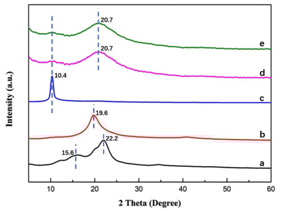The XRD patterns of (a) CNFs, (b) PVA, (c) GO, (d) CNF/PVA/GO and (e) TMCS/CNF/PVA/GO aerogels are shown in Figure 5. The distinct peak at 2θ = 22.5° observed from CNFs (Figure 5a) was attributed to the typical reflection planes (002), and a broad peak at around 15.6° was assigned to the (101) and (10) lattice planes of the cellulose I crystalline structure []. The XRD pattern of the PVA (Figure 5b) exhibited a broad peak at 2θ = 19.6°, which was ascribed to the orthorhombic lattice structure of semi-crystalline PVA []. GO exhibited a diffraction peak at 2θ = 10.4° (Figure 5c), corresponding to the (002) crystal plane []. The diffraction peaks of the CNFs, PVA and GO all appeared in the CNF/PVA/GO aerogel (Figure 5d). A broad peak was observed at 2θ = 20.7° and the peak intensity decreased, corresponding to the diffraction peaks of the CNFs and PVA. Moreover, the peak of GO sharply weakened, probably due to the relatively small amount of GO added to the sample. The TMCS/CNF/PVA/GO aerogel (Figure 5e) did not show any different diffraction peaks of CNF/PVA/GO aerogel as the TMCS silylation reaction only occurred on the aerogel surface without changing its chemical structure.