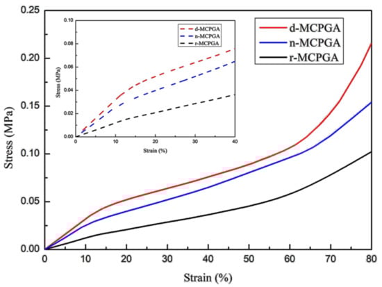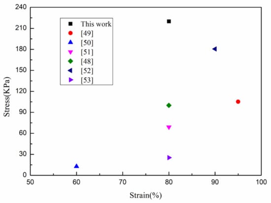 The mechanical properties of aerogels were influenced by many factors, such as raw materials and ratios, material properties of each component, and microstructure. Under the same raw materials and ratios, different preparation methods have produced aerogels with different microstructures. This structural difference played a key role in influencing the mechanical properties of aerogels. The compression behavior of aerogels (d-MCPGA, r-MCPGA, n-MCPGA) made by CNFs, PVA and GO using the directional freeze-drying method is shown in Figure 6, and the compression behavior of aerogels prepared by conventional refrigerator freeze-drying and non-directional freeze-drying are used as contrast. The curve characteristics of this three-characteristic deformation region of Figure 6 are consistent with previous studies []. The compressive stress of r-MCPGA at 80% strain reached 0.11 MPa, slightly higher than other cellulose-based aerogels described in previous studies []. This result might be attributed to the strong interaction between the CNFs and GO through hydrogen bonding and the addition of PVA with a long polymeric chain that could bond with the high density hydrogen of the CNFs and GO. At 80% strain, the ultimate compressive stress of d-MCPGA (0.22 MPa) was two times higher than that of r-MCPGA (0.11 MPa) and about 1.5 times higher than that of n-MCPGA (0.15 MPa). This significant increase might be due to the microstructure of the radially aligned directional aerogel (Figure 3b). Moreover, the d-MCPGA had a higher compressive capacity than most of the reported oil-absorbing materials. Figure 7 compares the compressive strength of d-MCPGA and other oil-absorbing materials. The directional freezing process caused the aerogel to have an axially ordered vertical pore structure, which contributed to the high strength characteristics of the d-MCPGA, but the extrusion behavior destroyed its internal orientation structure and caused the structure to be unrecoverable; thus, d-MCPGA had high strength but was relatively inferior in flexibility and repeatability.