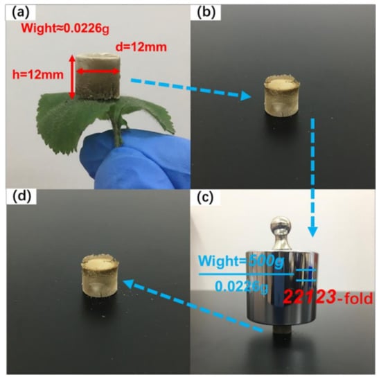 As shown in Figure 8a–d, 0.0226 g of lightweight d-MCPGA were placed on the young leaves and carried a weight of 500 g without any deformation (bearing more than 22123 times its own weight), which far exceeded the previous the study. This high strength was mainly attributed to the excellent entanglement of CNFs with PVA and GO, and the directional freeze-drying method formed a highly oriented microstructure.