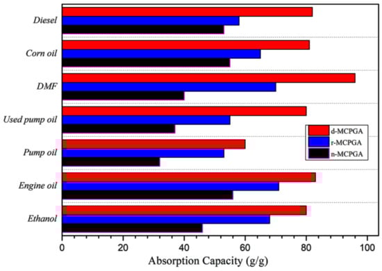 Absorption capacity of MCPGA (d-MCPGA, r-MCPGA, n-MCPGA) for different oils and organic liquids.