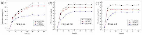 As shown in Figure 12, the absorption capacity of (a) pump oil; (b) engine oil and (c) corn oil on the MCPGA (d-MCPGA, r-MCPGA, n-MCPGA) was plotted as a function of absorption time. MCPGA took about 20–40 s to achieve the absorption balance of oil and pump oil, while in corn oil it only needed 10 s. The greater the viscosity of liquid, the worse the fluidity and the slower the movement of the molecules. Therefore, the pump oil with higher viscosity reached the absorption saturation in a longer time (viscosity: pump oil > engine oil > corn oil). During the adsorption process, initial adsorption rate was faster and slowed down over time until the adsorption stopped, which might be attributed to the pore structure of the porous aerogel providing a large number of channels for the oil. In addition, the surface and interior of the aerogel possessed a large number of available active adsorption sites, which tended to saturate with time []. There was no significant difference in the adsorption rate of d-MCPGA and r-MCPGA. As can be seen from Figure 12b,c, the adsorption rate of n-MCPGA was relatively slow, which might be due to its smaller pores and the narrower channels.