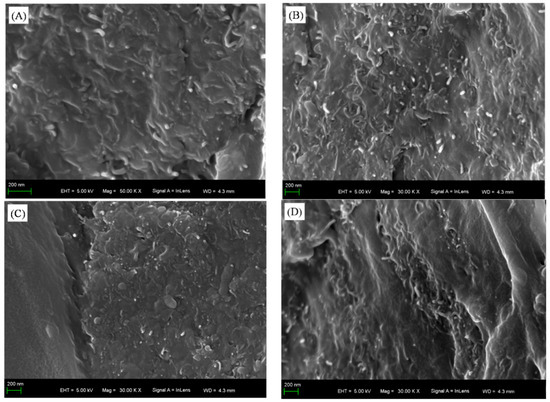 Cross-sectional morphologies of waterborne polyurethane (WPU) coatings with different multi-walled carbon nanotube (MWCNT) contents: (A) coating prepared by electrostatic spraying (ESC) with 0.3 wt% MWCNT, (B) ESC with 0.6 wt% MWCNT, (C) coating prepared by brushing (BrC) with 0.3 wt% MWCNT, and (D) BrC with 0.6 wt% MWCNT.