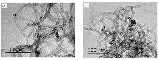 Figure 1 shows cross-sectional morphologies of WPU coatings with different MWCNT contents. When the MWCNT content was 0.3 wt% (Figure 1A), the MWCNTs in ESC were relatively evenly dispersed without obvious agglomeration and sedimentation. Although MWCNTs did not come into contact with each other, the generation of tunneling effect from the close average distance between them would enable the composite coating to conduct electricity [25]. As the MWCNT content increased to 0.6 wt% (Figure 1B), there were no apparently agglomerated MWCNTs in the ESC, and they intertwined with each other to form an infinite conductive network. The presence may be explained as follows. Due to the good atomization performance of ES, the still-agglomerated MWCNTs that had been treated by magnetic stirring and ultrasonic dispersion could be dispersed again. Thus, the agglomeration and sedimentation of MWCNTs could be weakened to some extent. Moreover, it was obvious that the morphology of BrC was different from that of ESC. When the MWCNT content was 0.3 wt%, there were few MWCNTs in WPU resins in the top area of BrC (Figure 1C), resulting in BrC being unable to conduct electricity. As the MWCNT content increased to 0.6 wt%, MWCNTs in BrC came into contact with each other to form a valid conductive network (Figure 1D). However, the MWCNTs were apparently agglomerated and deposited due to their uneven distributions, and the structure of BrC was thus less compact. The dispersion of MWCNTs in WPU resins was further studied by TEM. Figure 2A,B show the morphologies of MWCNTs in uncured ESC with 0.6 wt% MWCNT and BrC with 0.6 wt% MWCNT, respectively, on the surfaces of the steel substrates. Compared with the morphology of the MWCNT in ESC with 0.6 wt% MWCNT (Figure 2A), there were obvious agglomerated MWCNTs in BrC with 0.6 wt% MWCNT (Figure 2B), and the size of the agglomerated MWCNT particles was about 150–200 nm. The result was consistent with that of SEM.