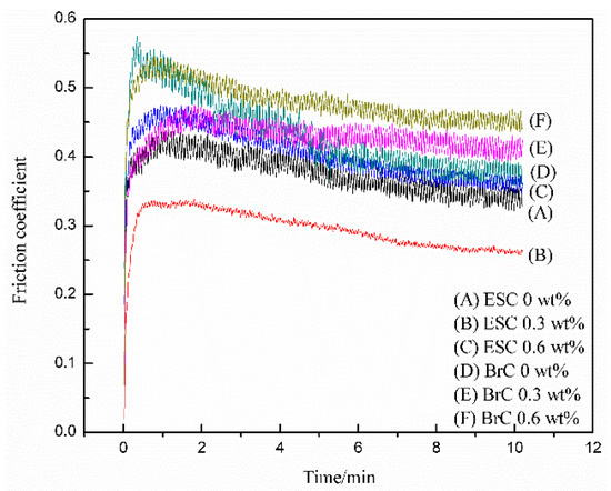 The analysis of the wear rate and friction coefficient curves of BrC (Figure 4 and Figure 5) showed that the wear resistance of BrC was worse than that of ESC, and the friction coefficient–time curve of BrC was very wavy. This may be due to the uneven dispersion of MWCNTs and the poor compactness of BrC. In addition, the upward trend of agglomerated MWCNTs with the increase in the MWCNT content may have increased the microdefects in BrC. As the friction time increased, the number of worn pieces in the coating also increased. It came into the wear track as a kind of abrasive material, thus increasing the wear rate and friction coefficient of BrC. Figure 6D–F show wear track morphologies of BrC after the wear test. It is evident that the wear track of BrC was wider and deeper than that of ESC, and the number of worn pieces on the wear track of BrC was greater compared with that of ESC. Additionally, the degree of wear of BrC was aggravated with the increase in the MWCNT content.