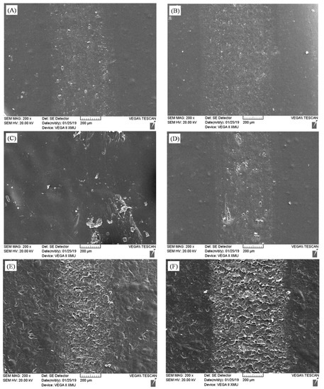 When the test on the wear was finished, the surface morphology of the wear track was observed with a VEGA3 XMU SEM (TESCANSCAN, Brno, Czech) to characterize the effect of ES on the wear resistance of the water-based conductive coating.