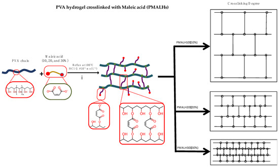 Three types of PMALH formulations with different crosslinking degrees were prepared. The preparation of PMALHs was performed through the esterification of PVA with MAL—a dicarbolxylic acid molecule—according to Valdés et al. [24]. Concisely, the chemical syntheses were carried out by mixing a 10 wt % aqueous solution of PVA with an aqueous solution of MAL in the presence of 1 × 10−1 mol·L−1 HCl (pH 1). The final concentrations of MAL were 10, 20, and 30 wt % for PMALH-10, PMALH-20, and PMALH-30 formulations, respectively. The reaction mixtures were kept under reflux at 90 °C in a necked flask with magnetic stirring for 3 hours. After that, the reaction mixtures were put in an oven at 70 °C for another 3 hours to remove water by evaporation and increase the crosslinking degree. Next, the PMALH hydrogels were washed three times with NaHCO3 and one time with distilled water to remove the excess acid. Finally, the formulations were freeze-dried to achieve the xerogels.