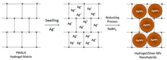 The PMALH synthesized hydrogels were used as template to obtain nanohybrids based on a silver nanoparticle-hydrogel. In Figure 2, a scheme of the synthesis process for the preparation of these nanohybrids is illustrated. During the hydrogel swelling in the silver nitrate solution, the silver ions (Ag+) are stabilized into the hydrogel pores. The metal ions are fixed to the functional groups of hydrogel networks (alcohol “–OH” and carboxylic groups “–COO−“ available). Therefore, large amounts of silver ions can be trapped in the cavities of the hydrogel networks. Subsequently, at the intermolecular level, in situ reduction of silver ions to nanoparticles (using NaBH4) is occurring and AgNPs are stabilizing into PMALH hydrogel networks. The initial appearance of the hydrogel (colorless) changes quickly to dark brown given the in situ reduction process of silver. Unlike the hydrogel, the supernatant maintains the same appearance (colorless). In agreement with previous works, the produced nanoparticles in the network can inhibit the aggregation for an extended period of time and they can easily be desorbed toward the water [17].