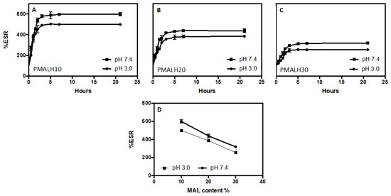 The swelling index depends on the polymer characteristics, the average molecular weight, flexibility of the polymer chain, the crosslinking degree, and the network mesh size, among others. Moreover, the swelling index depends on external conditions, such as temperature and pH [25]. Regarding the pH, the prepared hydrogels presented pH-dependent swelling behavior owing to ionic networks. In this context, the three hydrogels absorbed a higher amount of water at pH 7.4 than pH 3.0. The ionic networks contain acidic pendant groups provided by the crosslinker (MAL), which have two types of pKa (pHa1 = 1.93 and pKa2 = 6.59) [26]. As has been demonstrated in previous articles, this characteristic at a certain pH provides higher ionization degree in the matrix, causing an increase of electrostatic repulsion between chains from the networks [27]. Therefore, the electrostatic repulsion generated a higher uptake of solvent into the matrix increasing the size of the hydrogel [28]. Furthermore, at all pHs a higher swelling ratio was observed with PMALH10 (Figure 3A); this is due to the lower crosslinking density and higher flexibility of the hydrogel. Specifically, at pH 7.4 and 3.0, PMALH10 presented an ESR with values near to 600% and around 500%, respectively. On the contrary, the PMALH20 and PMALH30 showed a significant ESR reduction, (PMALH20 at pH 7.4 = 400% and pH 3.0= 350%, PMALH30 at pH 7.4 = 300% and pH 3.0= 250%, as represented in Figure 3B,C). Furthermore, the swelling degree detected might be associated with the absorption process that governs the diffusion of water molecules and other hydrophilic molecules, such as salts, into the pores of the hydrogel network [29].