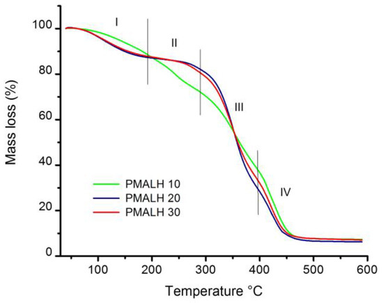 The PMALH analysis and characterization was studied through thermogravimetric analysis (TGA). Figure 4 displays the TGA curves from each of the three different synthetized PMALHs with different concentrations of MAL. Moreover, the thermal stability was measured, where it is possible to divide the thermogram in four regions. The first region occurred between 40 and 180 °C, mainly owing to the loss of moisture and physically weak and chemically strongly bound water [27]. This is possible due to the free PVA concentration; the mass loss of three formulations was very similar (90.3%, 87.8%, and 88.4%). However, in PMALH10 it was observed that the water was physically lower than the water chemically because there were more free chain PVAs. The second region occurred between 180 and 280 °C, attributed to the degradation of free PVA. The third region between 280 and 385 °C was attributed to the formed hydrogel, mainly between PVA and MAL. The fourth region occurred between 325 and 450 °C with a crosslinker between the chain of PVA and MAL. A final decomposition of carbonaceous matter at 485 °C was observed.