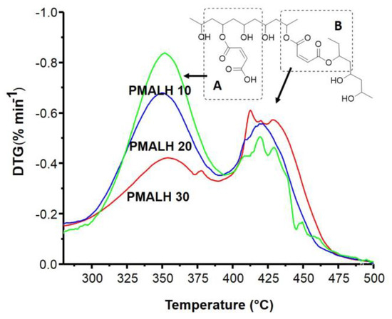 In the analysis of DTG (Figure 5), different maximum temperatures of degradation was observed. The first signal (near to 350 °C) could correspond to the covalent ester bonds formed between PVA chains and MAL (partially bound at one end with PVA), as depicted Figure 5b. The second signal (neat to 425 °C) may be attributed to the covalent ester bonds PVA-MAL-PVA (bound at the two ends to PVA chains), as depicted Figure 5c. On the other hand, the different areas of maximum temperature of degradation can be attributed to the different crosslinking degrees of each prepared formulation.