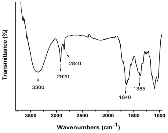 Figure 6 showed the spectrum of FT-IR with some characteristic signals that demonstrated the formation of the hydrogel. Between 3050 and 3700 cm−1 there is a strong signal from strength vibration that may be attributed to the alcohol of the PVA chain and hydration grade of the hydrogel. At 2920 cm−1, the characteristic signal of alkyl (R–CH2) stretching modes of the PVA chain was observed [27]. Moreover, typical signals of the PVA spectrum stretching band at 2840 cm−1 were observed. The crosslinking formation between PVA and MAL can be observed in the signal at 1640 cm−1, which corresponds to the covalent ester bonds formed between the alcohol of PVA chains and carboxylic acid of MAL [30].