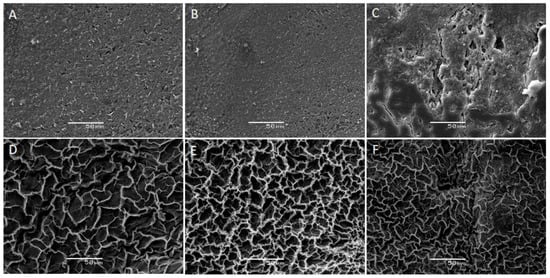 SEM analysis proves the morphological differences in both stages of the hydrogel. The three types of PMALHs without AgNPs and PMALHs with AgNPs are illustrated in Figure 7. Specifically, Figure 7A–C shows SEM micrographs of hydrogels without AgNPs (PMALH10, PMALH20, PMALH30). SEM micrographs of hydrogels with AgNPs ((PMALH10-AgNPs, PMALH20-AgNPs, PMALH30-AgNPs) are shown in the Figure 7D–F. On the SEM micrograph of PMALH10 and PMALH20, the smooth walls and an assembly of marked fiber networks can be observed. However, the SEM micrograph of PMALH30 shows a saturated surface, which makes it difficult to identify fibers from the network. These types of assembly with suitable permeability play a key role to allow the Ag+ ions diffusion through the pores when they were absorbed. The three systems presented irregular edges with well-marked reliefs on the surface. The common characteristic in the series of hydrogels was the presence of valleys between the reliefs that gradually decreased in size from PMALH10 to PMALH30.