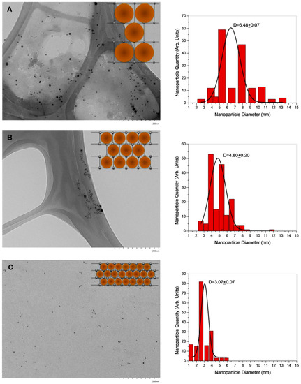 TEM images (Figure 8A–C) show the AgNPs stabilized within the hydrogel network synthesized with different crosslinking degrees (hydrogel/silver nanohybrids). From the micrographs, 170 nanoparticles were analyzed and their size distribution were calculated, as is illustrated in the respective histogram. Gaussian curves were fitted to the distributions; the curve center corresponds to the average nanoparticle diameter. For the samples of PMALH10-AgNPs, PMALH20-AgNPss and PMALH30-AgNPs, the average AgNP sizes were 6.48 ± 0.07 nm, 4.80 ± 0.20 nm, and 3.07 ± 0.07 nm, respectively, with a spherical shape and narrow size distribution. According to the AgNP size and their distribution within the hydrogel network observed by TEM images, it is possible to confirm that the available free-network spaces or cavities in the hydrogel networks allow growth and stabilization of the nanoparticles with a narrow size distribution. With these results it can be confirmed that the PMALH hydrogel network can be used as a template to prepare tunable-size AgNPs, such as those illustrated in Figure 8.
