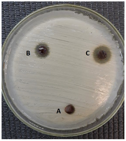 Screening of antibacterial effect of (A) PMALH10-AgNPs, (B) PMALH20-AgNPs, and (C) PMALH30-AgNPs nanohybrids against S. aureus.