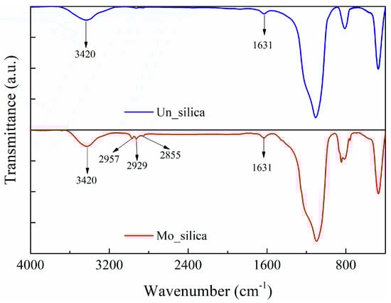 A Fourier Transform Infrared Spectrometer (FTIR) was used to investigate the chemical groups present on the surfaces of the nano-silica particles. The results are illustrated in Figure 2. The three peaks at 2855, 2929, and 2957 cm−1 of the transmittance spectrum of the modified nano-silica fillers represent the stretching vibration of C–H groups, indicating the existence of –CH2 and –CH3 groups on their surface, introduced by the surface modification agent. The wide peak at 3420 cm−1 reveals the existence of hydroxyl groups on the surfaces of both types of fillers whereas the small peak at 1631 cm−1 represents the bending vibration of the hydroxyl groups. The broad peak in the range of 1000–1200 cm−1 and at 810 cm−1 is the stretching vibration of Si–O bond.