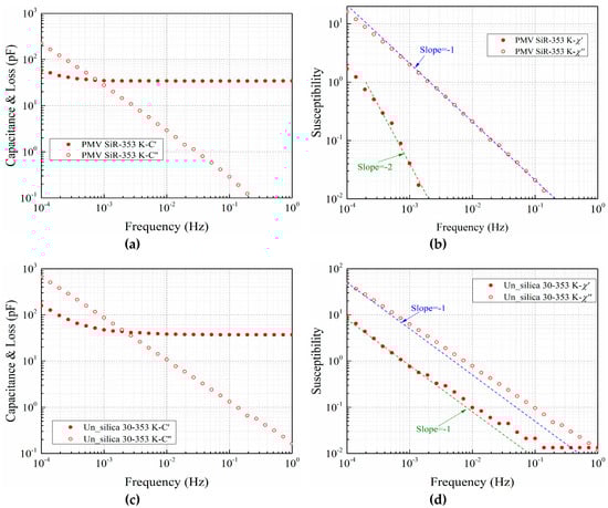 Figure 4 shows the complex capacitance C*(ω) and susceptibility χ*(ω) of pure silicone rubber (PMV SiR) and silicone rubber with nano-silica in logarithmic coordinates with solid and open dots representing their real and imaginary parts, respectively. χ*(ω) was calculated from the measured complex capacitance C*(ω) using Equation (1), where ε’(ω) and ε”(ω) denote the real and imaginary components of the relative permittivity, respectively. The infinite frequency term ε(∞) represents the contribution of the dielectric response in high frequency region beyond the measurement window [].