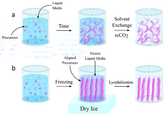 Comparison of aerogel fabrication strategies showing typical transitions into an aerogel. (a) shows the supercritical drying process where precursor materials undergo gelation prior to supercritical drying. Often, these processes include a solvent exchange step after gelation to provide better fluids for supercritical drying. (b) shows a standard freeze-drying technique where an aqueous solution is frozen and the ice crystal formation dictates the alignment of the precursor materials and thus, the resulting pore structure of the dried aerogel.