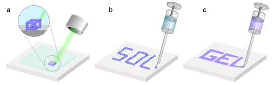 3DP of aerogel techniques are categorized depending on the sol-gel transitions during the printing process. These categories include: (1) direct ink writing (DIW), where a gel is formed prior to printing []; (2) stereolithography (SLA), where the sol-gel transition occurs during printing []; and (3) inkjet printing (IJP), where the sol-gel transition occurs after printing (Figure 3) []. SLA is a technique that prints 3D structures using photocurable materials through a process called photopolymerization, in which polymer layers solidify upon exposure to specific laser wavelengths (Figure 3a). IJP is a non-contact, droplet-based material deposition process, with the potential to be modified to deposit photocurable materials to achieve patterning with high resolution (Figure 3b). DIW is an extrusion-based printing technique that involves the deposition of continuous ink filaments, in a layer-by-layer fashion, to realize the 3D constructs (Figure 3c).