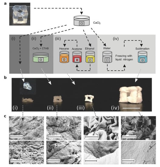 Another study of CNF aerogels explored the post-processing and drying of CNF gels after printing []. The CNF hydrogels contained 2 wt% cellulose (98 wt% water) and were printed via DIW. The printed grid cube was strong enough to support itself; however, the cube was transferred to a CaCl2 bath in order to reduce the surface charge of the fibrils, thereby allowing the crosslinking of the fibrils with one another, consequently increasing the strength of the structure. The structures were then dried by one of four different methods: (i) air drying, (ii) air drying in the presence of surfactants, (iii) solvent exchange before drying, and (iv) freeze drying, as depicted in Figure 6. The freeze-dried method exhibited a highly porous structure without much shrinkage or distortion of the original structure, whereas the air-died aerogel collapsed in the z-direction (Figure 6b). When tested for mechanical robustness, it was found that the freeze-dried aerogels had a tensile strength of 3.9 ± 2.7 MPa and a mean stiffness of 0.031 ± 0.019 GPa. The rest of the printed cubes were dried in air and had a mean ultimate tensile strength of 114 ± 14 MPa and mean stiffness of 4.3 ± 0.3 GPa. When dried in air in the presence of surfactants, the printed cubes resulted in significant shrinkage, but still managed to retain their 3D structures due to homogenous drying. The solvent exchange study was performed so that a less polar liquid than water could retain the structure as it is air-dried; however, the cubes resulted in similar shrinkage as for the surfactant method. Additionally, they found a large difference in the surface structures of the gels between fast and slow drying, where ice crystal growth has an effect on the timescale of particle rearrangement. They found that slow freezing produced rougher surface and fast drying resulted in dimensional stability. Ultimately, this study shows the versatility in tuning CNF aerogel properties, even after print, by controlling the post-processing and drying process.