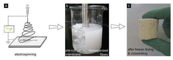 Creating an aerogel out of nanofibers enhances the specific surface area, improves the mechanical properties, and promotes innovative functionality in the aerogel structure. To produce the nanofibrous aerogels, supercritical drying or freeze-drying is performed on dispersions containing single nanofibers or nanofiber mats obtained from electrospinning. When making aerogels out of nanofiber mats, the mats are often cut into smaller fragments through sonication (i.e., dispersion cut) prior to aerogel formation []. One example of an aerogel derived from a single-nanofiber dispersion is the freeze-drying of a native or 3D-printed cellulose nanofibril gel dispersion, which was discussed in Section 3.1.2. In another work, a composite aerogel was fabricated by freeze-drying a homogeneous solution of electrospun SiO2 nanofibers, polyacrylamide, and aluminoborosilicate (AlBSi) []. During the freezing of the composite solution, the nanofibers gathered along the edges of the ice-crystals, giving a hierarchical lamellar structure in the final aerogel, differing from the typical circular porous structure found in other ceramic aerogels. Calcination of the aerogel removed the organic component, cementing the nanofibers within the network, and creating the amorphous SiO2 nanofiber-AlBSi ceramic aerogel. The resulting ceramic aerogel was found to have an ultralow density (0.15 mg/cm3), a porosity of 99.993% with pores ranging from 100–1000 nm, and a high elasticity. Interestingly, this aerogel was also found to be flame resistant. In another example, nanofiber mats composed of pullulan and poly(vinyl alcohol) were dispersion cut and freeze-dried to create a composite aerogel []. The porosity of the aerogel was found to be tunable as a higher volume fraction of nanofibers caused a decrease in the porosity of the aerogel. Additionally, more than one type of nanofiber mat can be combined during homogenization to provide different compositions and properties of the resulting aerogels. For example, one research group homogenized a mixture of two types of electrospun mats, polyacrylonitrile/bifunctional benzoxazine (PAN/BA-a) and SiO2 []. The dispersion of nanofiber mats was freeze-dried and crosslinked in situ in order to obtain a stable, hybrid aerogel comprised of both organic and inorganic nanofibers. The density can be tuned in the range of 0.53–9.6 mg/cm3 by varying the concentrations of the starting nanofiber dispersions. When tested in strain, such an aerogel was found to have a maximum stress value of 10.6 kPa (first elastic regime) while showing a strain of 36.1 kPa at 80% strain.