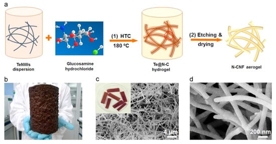 In recent attempts to mitigate the concerns of the aforementioned processing strategies, a new bottom-up approach called hydrothermal carbonization (HTC) has been used to produce nanofibers [,]. In this technique, organic compounds are treated in an aqueous environment at high temperatures (150–350 °C) and ambient pressures in order to form carbonaceous solid products. Qian et al. synthesized carbon nanofibers through HTC [] where glucose was self-assembled and grown around tellurium nanofibers, which served as a structural template for the aerogel. The solution containing the glucose and tellurium nanofibers was etched and washed to remove the inorganic materials prior to being freeze-dried to obtain the desired HTC-carbon nanofiber aerogel. In another study, the HTC-carbon nanofiber aerogel was synthesized from glucosamine, a nitrogen-containing carbohydrate []. This resulted in the formation of a nitrogen-doped carbon aerogel with enhanced electrical conductivity (Figure 8). The main benefit of this technique over electrospinning is the ability to control the diameters of the resulting fibers. HTC has produced nanofibers with very fine diameters (minimum: 25 nm) with a narrow size distribution, resulting in smaller secondary pore sizes []. In addition, a high yield of the converted carbon solids is obtained using HTC [,]. The downside of the HTC approach is that costly tellurium nanofibers are often used to guide the growth of the carbon nanofibers []. Future work could utilize other materials, such as low-cost inorganic nanowires and cellulose nanofiber, for the structural template making HTC a more feasible option.