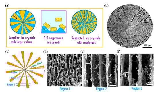 Schematics and images from the radially grown GO aerogels. (a) Illustrates the ice-templating process, (b) shows scanning electron microscopy (SEM) images of the radially aligned aerogel, (c) illustrates the decreasing width of the radial channels, which decrease from edge to center, and (d–f) show SEM micrographs of the sections outlined in (c). Adapted from [] with permission, copyright American Chemical Society, 2018.