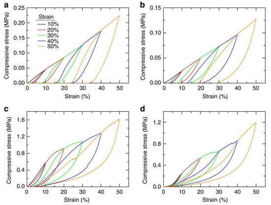 Reversible compressibility of various graphene aerogels created via DIW. Image (a) shows the behavior of a bulk graphene aerogel (31 mg cm−3), (b) 3D-printed graphene aerogel (16 mg cm−3), (c) bulk graphene aerogel (123 mg cm−3), and (d) 3D-printed graphene aerogel (53 mg cm−3) using resorcinol-formaldehyde. Reprinted from [] under open access license.