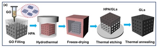 Some studies have investigated the feasibility of the 3DP (three-dimensional printing) of graphene aerogels. Such techniques would be excellent for tailoring the microarchitecture of the graphene aerogel for specific applications such as all-solid-state-batteries, micropressure sensors, flexible electrodes, and electrochemical catalyst templates []. In a study by Zhang et al., graphene aerogel lattice architectures were 3D printed using a modified inkjet printing (IJP) technique []. This 3DP method was relatively simple with only dilute aqueous GO solutions (1 mg/mL) being used as the printing material. In this IJP technique, the GO suspension was frozen by selectively solidifying the solution onto ice crystals that were grown on a cold sink cooled to −25 °C. These ice crystals were built with water droplets frozen during printing and the GO suspension was only ejected dropwise when needed. When the liquid solution was deposited on top of the previous layer, the newly deposited material melted the previous layer. The two layers mixed in this melted state and refroze together, firmly bonding the two layers to achieve the structural integrity desired. The 3D printed GO ice lattice was then immersed in liquid nitrogen for 30 min in order to achieve critical freezing and was subsequently further frozen in a freezer (−80 °C) for 24 h. This allowed for the sufficient assembly of the GO sheets. Once completely frozen, the materials were dried via freeze-drying for 48 h. Subsequent thermal treatment at 1000 °C for 30 min in an argon atmosphere reduced the GO to rGO. The use of a dilute GO suspension resulted in a very low density (0.5–19 mg/cm3) aerogel with a larger surface area when compared to other 3D printed graphene aerogels. The use of a multi-nozzle, drop-on-demand IJP technique coupled with freeze-drying enabled the control of both the micro- and macrostructure of the graphene aerogel. This resulted in an aerogel with high electrical conductivity of approximately 15.4 S/m, as well as high compressibility. The limitation of IJP arises as the 3D printed structure grows in the z-direction because maintaining a uniform temperature throughout the growing structure becomes increasingly difficult, which may affect the structural integrity of the final aerogel. Thus, a majority of 3D printed graphene aerogels are fabricated by DIW where a gel is obtained prior to deposition, as opposed to after deposition as in IJP.