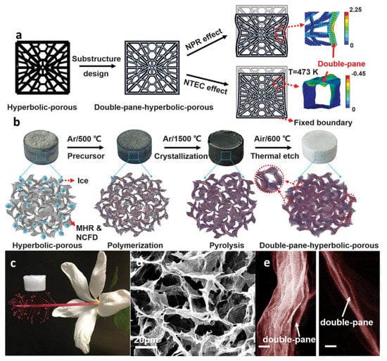 Hexagonal boron nitride (h-BN) has been attached to the single-walled carbon nanotube surfaces in a pre-fabricated carbon nanotube aerogel. The h-BN, as 2D flakes, strengthened the underlying SWCNT networks via reinforcement of the nodes between the SWCNTs, leading to a doubled Young’s modulus compared to that of SWCNT networks alone. Only 0.009% volume fraction of h-BN generated mechanically robust composite aerogels that recovered their original shape even after uniaxially compressing by more than 50% []. Duan and coworkers have produced double-negative-index graphene/h-BN composite aerogels with robust mechanical and exceptional thermal stability []. First, a hierarchical porous graphene template with hyperbolic architecture was fabricated through a modified hydrothermal reduction (MHR) and noncontact freeze drying (NCFD) technique to obtain a negative Poisson’s ratio (NPR) and a negative thermal expansion coefficient (NTEC) that enhanced the mechanical properties of the template (Figure 12a) []. h-BN was then deposited on the surface of graphene template through a chemical vapor deposition (CVD) process (Figure 12b). The resulting h-BN aerogels (h-BNAGs) had ultralow densities of less than 10 mg/cm3 with the lowest density being 0.1 mg/cm3 (Figure 12c). The ultralow density was attributed to the highly porous structure with h-BN layers on graphene aerogel templates (Figure 12d). Thermal etching of graphene templates from the h-BN/graphene sandwiched hybrids produced double-pane wall structures (Figure 12e). Such rational designed h-BN aerogels had near-zero strength loss after sharp thermal shocks (275 °C per second) or intense thermal stress at 1400 °C, and ultralow thermal conductivity in vacuum [~2.4 milliwatts per meter-kelvin (mW/m·K)] and in air (~20 mW/m·K), providing an ideal system for thermal superinsulation under extreme conditions.