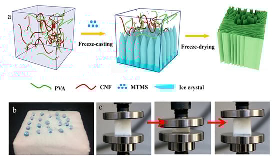 A new rapid supercritical extraction process has been reported by Jung et al. to produce hydrophobic and transparent aerogels suitable for window shielding []. The hydrophobic character was introduced by adding poly(methylmethacrylate) to a silica gel, resulting in the addition of –OCH3 and –CH3 free radicals onto the surface. A silica solution formed the gel structure with the supply of inert gas pressure. Then it was promoted at supercritical conditions through continuous heating. As mentioned previously, cellulose has been used widely in aerogels; however, the hydrophilicity and inferior mechanical properties of cellulose aerogels limit their applications in absorbing organic contaminants. Yu et al. produced high-performance cellulose aerogels by freeze-casting aqueous suspensions of polyvinyl alcohol and cellulose nanofibrils in the presence of hydrolyzed methyltrimethoxysilane sol []. The silanol groups (Si–OH) reacted with hydroxyl groups on PVA and cellulose, as well as condensed among themselves to form a Si–O–Si network, leading to robust hydrophobic aerogels. The aerogel has a high absorption capacity of 45–99 times of their own weights, high oil/water selective sorption, and excellent reusability with absorption retention of more than 84% after 35 absorption–squeezing cycles (Figure 13).