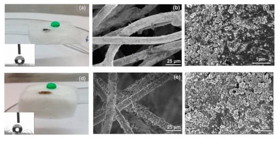 Commercially available, flexible and mechanically durable fiber-reinforced silica aerogel composites have been evaluated for oil spill cleanup (Figure 14) []. Thermal Wrap (TW) (6.0 mm thickness, Cabot Corporation, Boston, MA) is a composite of trimethylsilylated silica aerogel particles attached on bicomponent polyester fibers, and Spaceloft (SL) (10 mm thickness, Aspen Aerogels, Northborough, MA, USA) is a composite of a lofty fibrous batting of polyester and glass fibers infiltrated with trimethylsilylated silica aerogel and magnesium hydroxide. As shown in Figure 14, both aerogel blankets have hydrophobic silica nanoparticles attaching to fibers, leading to a hydrophobic/oleophilic property. The study indicated that these aerogel composites possessed three important desirable properties for oil spill cleanup: fast oil sorption (3–5 min), reusability (demonstrated over 10 cycles with preserved tensile strength for TW; 380–700 kPa), and recoverability (up to 60% via mechanical extraction).