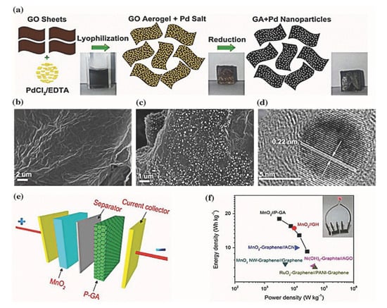 Graphene aerogels have often been composited with conductive polymers and highly electroactive nanoparticles in order to create supercapacitor electrodes with very high capacitances and cycling stabilities. Graphene functions as a support of polymers and nanoparticles with larger surface area and electrical conductivity. Many unique strategies have been employed to offer fabrication techniques that are both affordable, eco-friendly, and easily scalable. Zhai and coworkers fabricated high-performance supercapacitor electrodes using graphene aerogel (GA) doped with palladium (Pd) nanoparticles (Figure 15a) []. The SEM images of GA and P-GA samples and the TEM image of Pd nanoparticles showed that Pd nanoparticles uniformly distributed on graphene surfaces (Figure 15b–d). Pd nanoparticles caused a significant reduction of the electrical resistivity by 50 times (i.e., from 950 to 16 Ω cm) compared with pure GAs. Additionally, a negative electrode based on P-GA showed a specific capacitance of 175.8 F/g at a scan rate of 5 mV/s, which is more than 3 times enhancement as compared to that without Pd doping (51.9 F/g). The MnO2//P-GA asymmetrical supercapacitors were produced from the composite aerogel electrodes and demonstrated an average energy density of ≈13.9 Wh/kg at a power density of ≈13.3 kW/kg, which was much higher than other graphene- and carbon-based asymmetrical supercapacitors. (Figure 15e,f). Reduced graphene oxide (rGO) and polypyrrole (PPy) composite aerogels were produced by Sun and co-workers employing a spontaneous self-assembly approach []. In their study, pyrrole was added to an aqueous graphene oxide (GO) suspension, where pyrrole was polymerized and deposited on reduced GO to obtain the rGO-PPy hybrid hydrogel. The hydrogels were washed with ethanol and supercritically dried with CO2. Through combining the GO sheets with the PPy, aggregation of the GO sheets was prevented, which created a thin walled, hierarchical porous structure of the hybrid aerogels. The CV curves of such aerogels indicated both pseudocapacitive and electrochemical double layer capacitance (EDLC) with a specific capacitance of 304 F/g at a current density of 0.5 A/g (Table 2). While showcasing the promise of such a one-step fabrication method for graphene aerogel hybrids, these materials quickly degraded performing at only 58% of their original capacitance after 50 cycles.