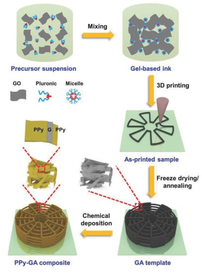 - Qi, Z.; Ye, J.; Chen, W.; Biener, J.; Duoss, E.B.; Spadaccini, C.M.; Worsley, M.A.; Zhu, C. 3D-Printed, Superelastic Polypyrrole-Graphene Electrodes with Ultrahigh Areal Capacitance for Electrochemical Energy Storage. Adv. Mater. Technol. 2018, 3, 1800053. [Google Scholar] [CrossRef]