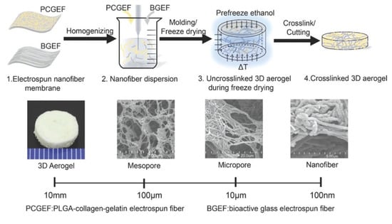 The processing schematic of aerogel fabrication via the electrospinning of nanofiber mats. Reprinted from [] with permission, copyright American Chemical Society, 2018.