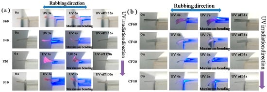 - Pang, X.; Xu, B.; Qing, X.; Wei, J.; Yu, Y. Photo-induced bending behavior of post-crosslinked liquid crystalline polymer/polyurethane blend films. Macromol. Rapid Commun. 2018, 39, 1700237. [Google Scholar] [CrossRef]