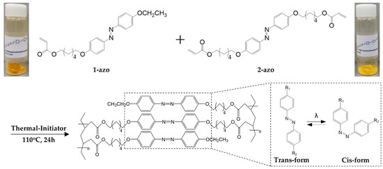 Chemical structures of the azobenzene liquid crystalline monomers (1-azo and 2-azo) used in this study and their polymerization schemes (the isomerization of the azobenzene group under ultraviolet light irradiation is indicated by the right dotted line).