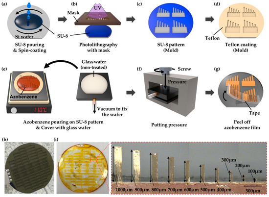 The manufacture of an azobenzene actuator consists of three main steps: mold fabrication on wafers using lithographic techniques (Figure 2a–d), monomer and pressure loading on the mold (Figure 2e,f), and polymerization (Figure 2g).