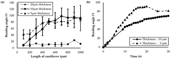 (a) Maximum bending angle as a function of actuator length and thickness; (b) change in the bending angle with respect to the ultraviolet exposure time. Actuators with thicknesses of 10 μm and 5 μm (solid and dashed lines, respectively) were compared.
