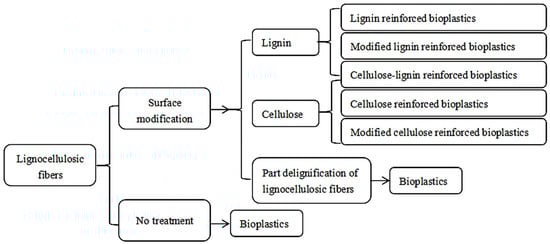 The addition level of lignocellulosic fibers in bioplastics is seriously restricted by the low compatibility. There are a variety of pretreatment methods to overcome these problems. However, most of the products or residues of these pretreatments have been based on biomass biorefining which removes lignin. This process is technically demanding and profitably impractical because lignin is also widely used in bioplastics [38,138]. Therefore, in this section we will review a few examples about lignin-containing cellulosic fibers to produce bioplastics (Figure 4). To some extent, we can regard them as lignocellulosic fibers which remove water soluble matter and hemicellulose. Therefore, these lignocellulosic fibers have a higher hydrophobic character and lower intermolecular interaction. In the end, we summarize the ways attempted to enhance the interaction between lignocellulosic fibers and biopolymers or to reduce the degree of association of lignocellulosic fibers without delignification when developing the bioplastics.