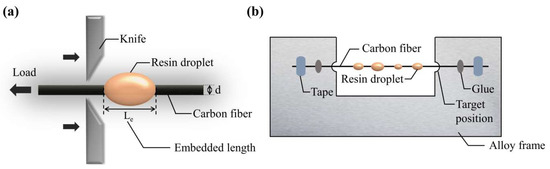 The microdroplet test was conducted on HM410 evaluation equipment, which determines the interfacial property of composite material (Tohei Sangyo Co., Ltd, Tokyo, Japan)—to directly test the interfacial sheer strength (IFSS) between CF and PEEK. The process is illustrated in Figure 3a. In this experiment, each microdroplet was clamped by two steel blades and pulled to separate with the fiber at a constant speed of 0.1 mm/min. The microdroplet test specimens were prepared on alloy frames (30 mm × 70 mm) with the free fiber length ~30 mm between the frames. Both sides of the CF single fiber were firmly fixed on the alloy frame, and some oval PEEK droplets obtained by melting the PEEK fibers were formed on a CF monofilament, as shown in Figure 3b. To obtain perfectly shaped PEEK droplets, we started by laying an alloy frame fixed with filament on a closed heating platform at 375 °C for 10 min and sequentially melted one side of the PEEK tows while holding the other side to form fine PEEK fiber to cross the monofilament. This process was repeated for a sufficient number of times. The single fiber composite specimens were then transferred to a vacuum oven at 375 °C for 5 min to reheat the composite specimens in order to obtain perfectly shaped microdroplets and wetted interfaces.