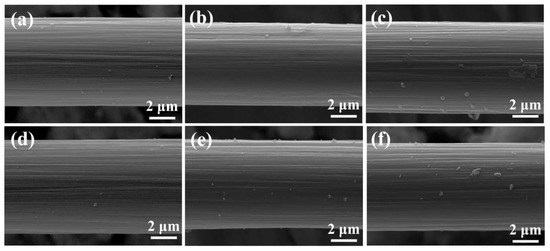 SEM images of carbon fibers (CFs) at different plasma treatment times: (a) untreated CF, (b) CF–AA15 (Ar 15 s, air 15 s), (c) CF–air, (d) CF–Ar, (e) CF–AA1 (Ar 1 min, air 1 min), and (f) CF–AA5 (Ar 5 min, air 5 min).