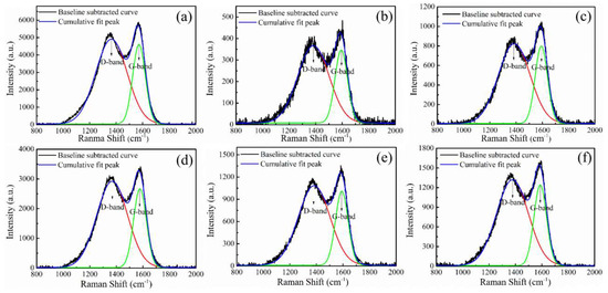 Raman spectra and their cumulative fit peaks for CFs before and after different plasma treatments: (a) untreated CF, (b) CF–air, (c) CF–Ar, (d) CF–AA15, (e) CF–AA1, and (f) CF–AA5.